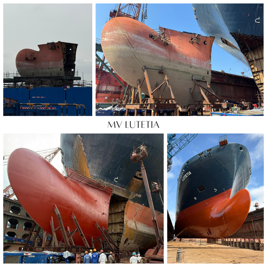 MV Lutetia is currently in the shipyard, where she has successfully completed a bow optimization to improve her hydrodynamic efficiency and overall performance.